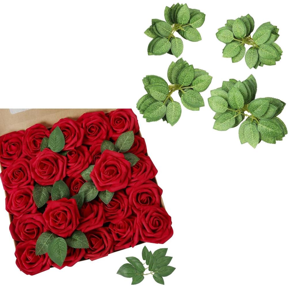 imageAmyHomie 50pcs Dark Red Rose wStem and 40pcs Leaves for DIY Wedding Bouquets Centerpieces Arrangements Party Baby Shower Home Decorations