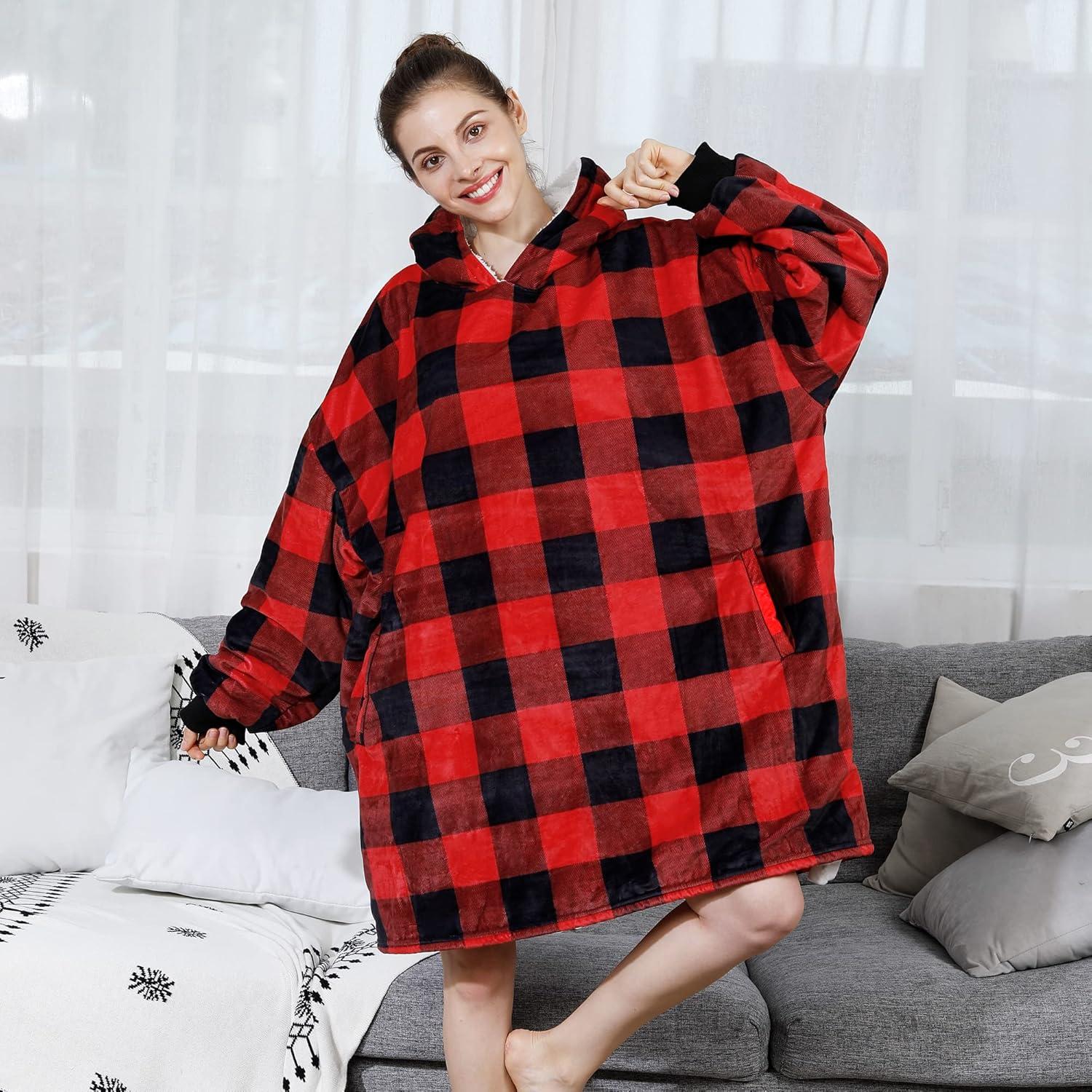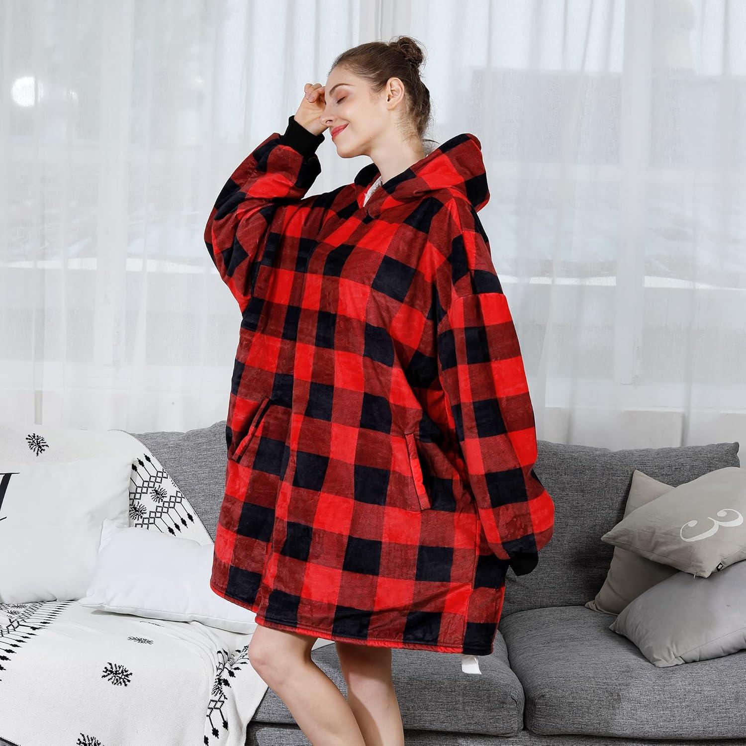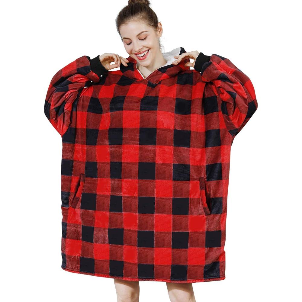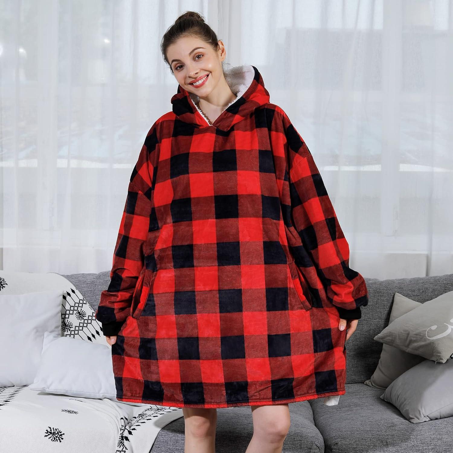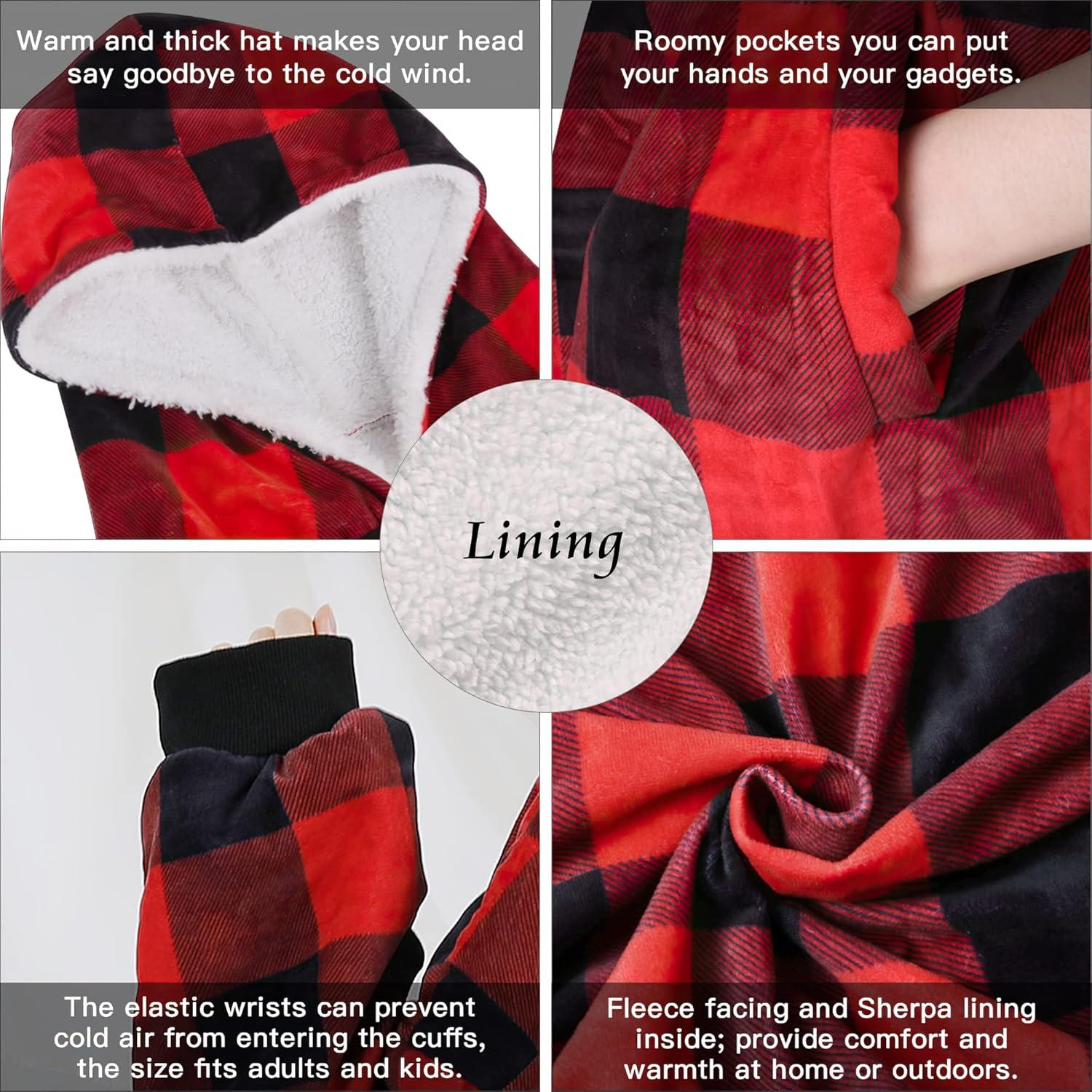 AmyHomie Blanket Sweatshirt,Oversized Sherpa Hooded Blanket Hoodie,Fleecehug Hoodie Wearable Blanket for Women Men Kids(Red Plaid)