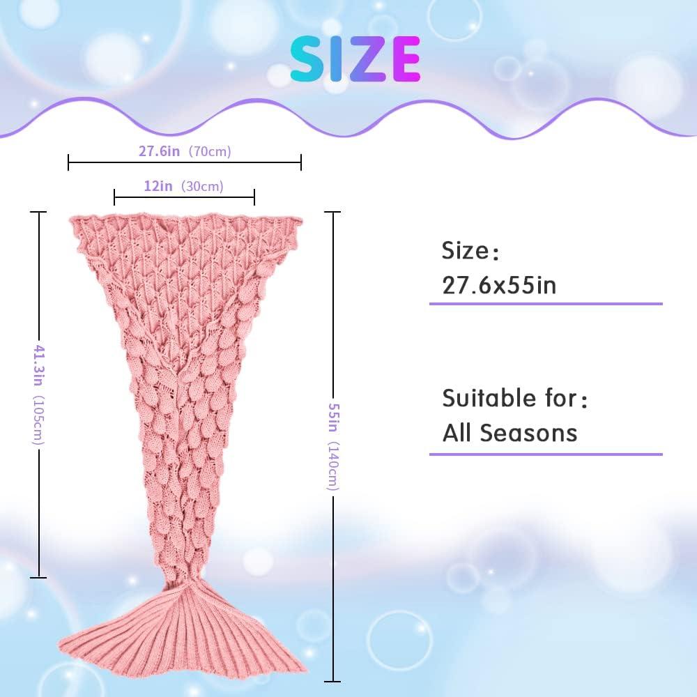 🎊 Mermaid Blankets for Kids and Adults — Kids blanket size is around 55×28 in (140×70 cm)Adults blankt size is about 71 x36 inch(180×90 cm). Made of Eco-friendly and Skin-friendly fabric without any allergies. Mermaid blanket suitable blanket gift toy for girl, top gifts for 3-7 year old girls.